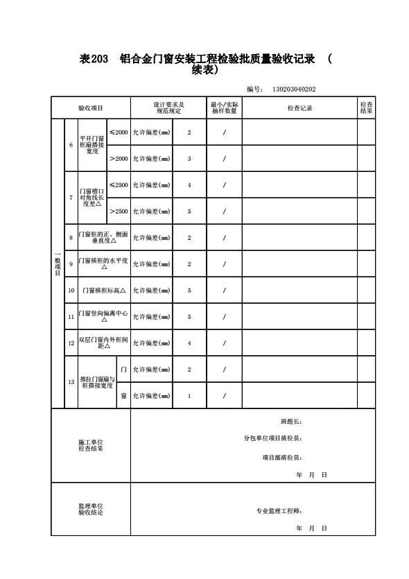 表格名称:130203040202 铝合金门窗安装工程检验批质量验收记录