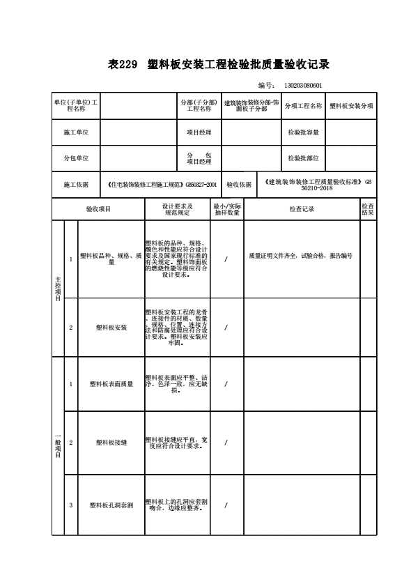 表格名称:130203080601 塑料板安装工程检验批质量验收记录