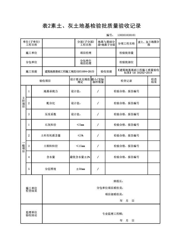 表格名称:130301030101 素土、灰土地基检验批质量验收记录