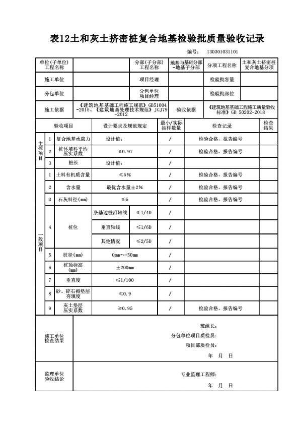 表格名称:130301031101 土和灰土挤密桩复合地基检验批质量验收记录