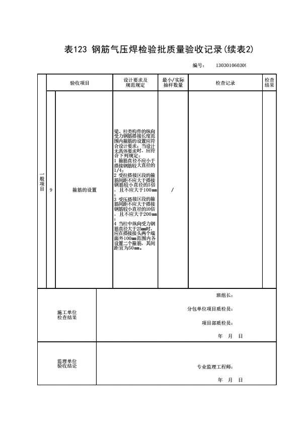 表格名称:130301060309 钢筋气压焊检验批质量验收记录