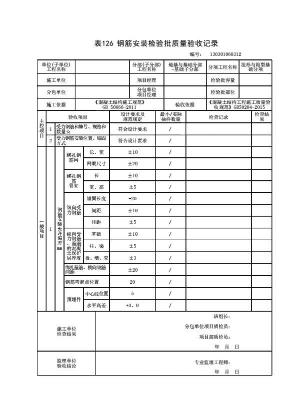 表格名称:130301060312 钢筋安装检验批质量验收记录