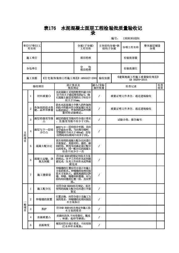 表格名称:130303010201 水泥混凝土面层工程检验批质量验收记录