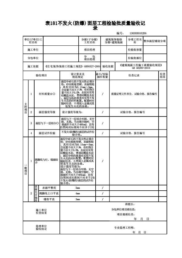 表格名称:130303010206 不发火(防爆)面层工程检验批质量验收记录