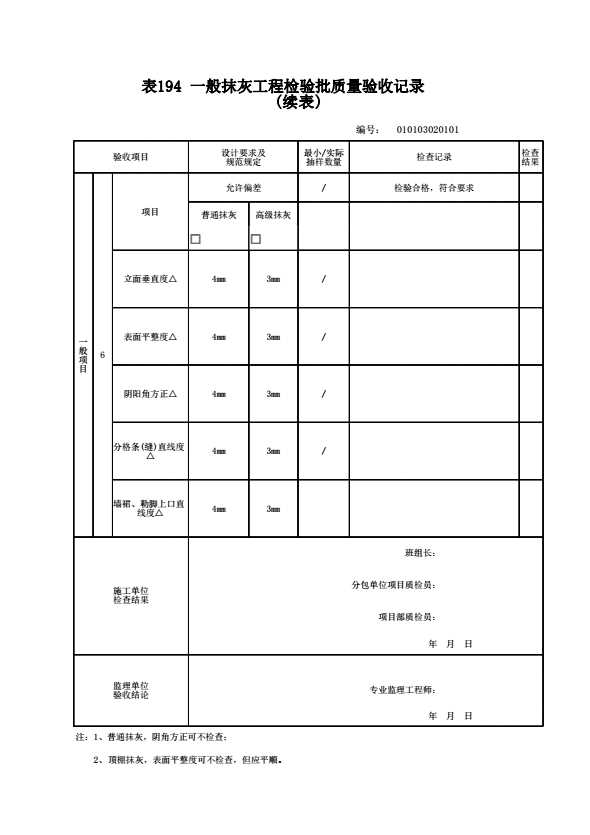 表格名称:130303020101 一般抹灰工程检验批质量验收记录