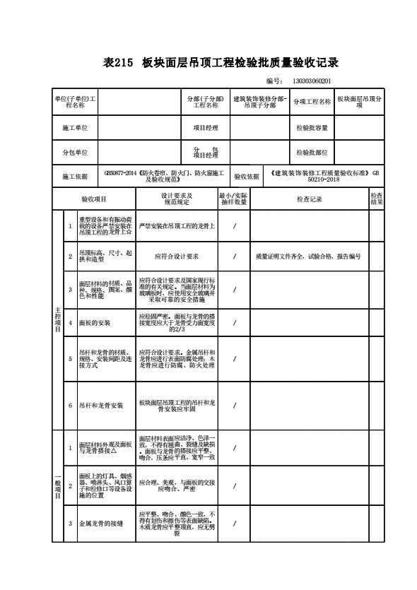 表格名称:130303060201 板块面层吊顶工程检验批质量验收记录