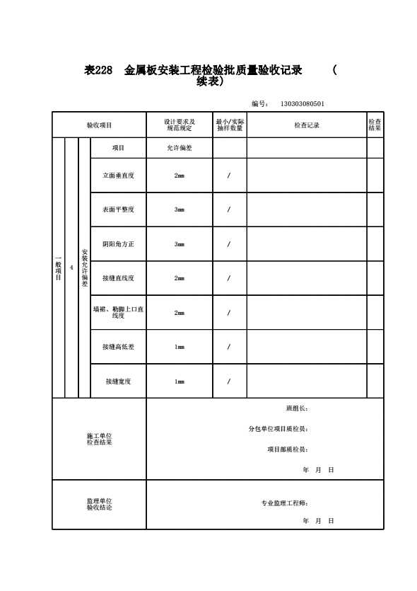 表格名称:130303080501 金属板安装工程检验批质量验收记录