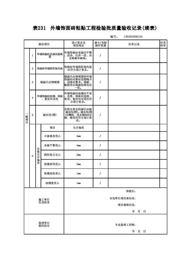 表格名称:130303090101 外墙饰面砖粘贴工程检验批质量验收记录