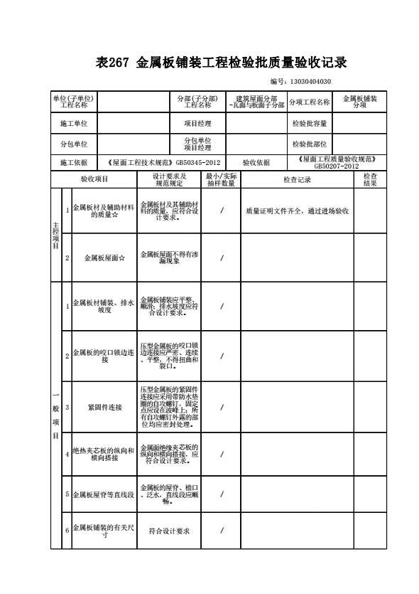 表格名称:130304040301 金属板铺装工程检验批质量验收记录