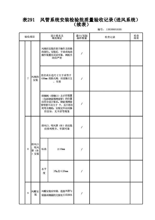 表格名称:130306010301 风管系统安装检验批质量验收记录(送风系统)