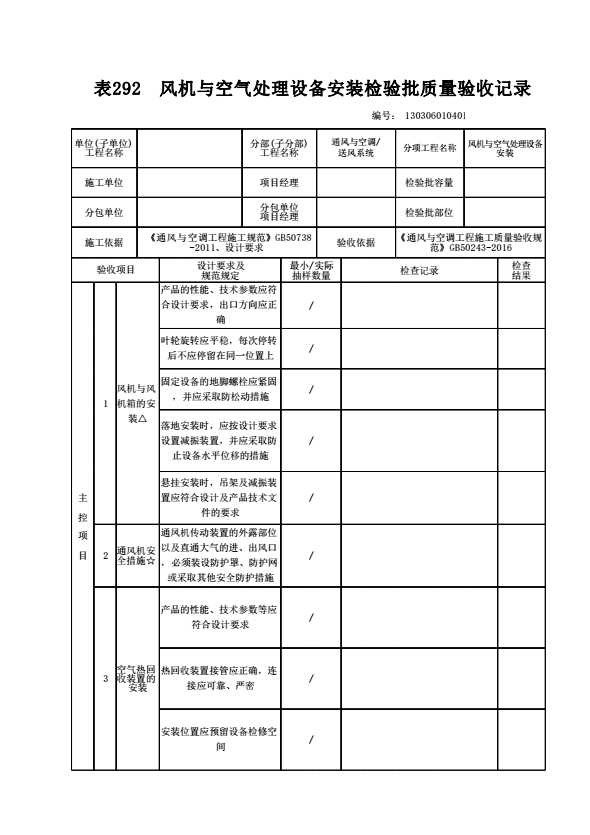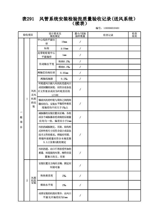 表格名称:130306010401 风机与空气处理设备安装检验批质量验收记录