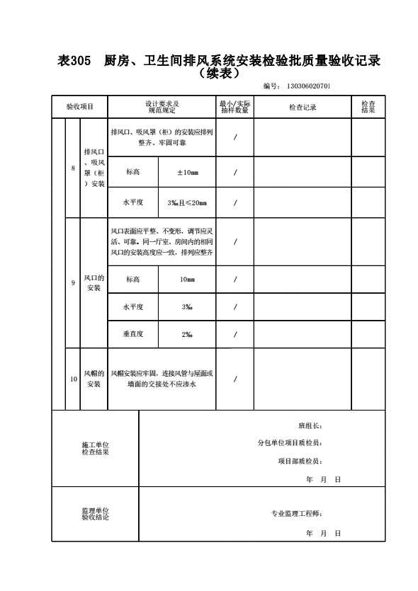 表格名称:130306020701 厨房、卫生间排风系统安装检验批质量验收记录