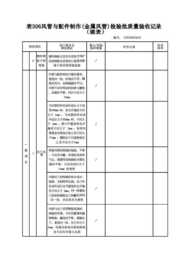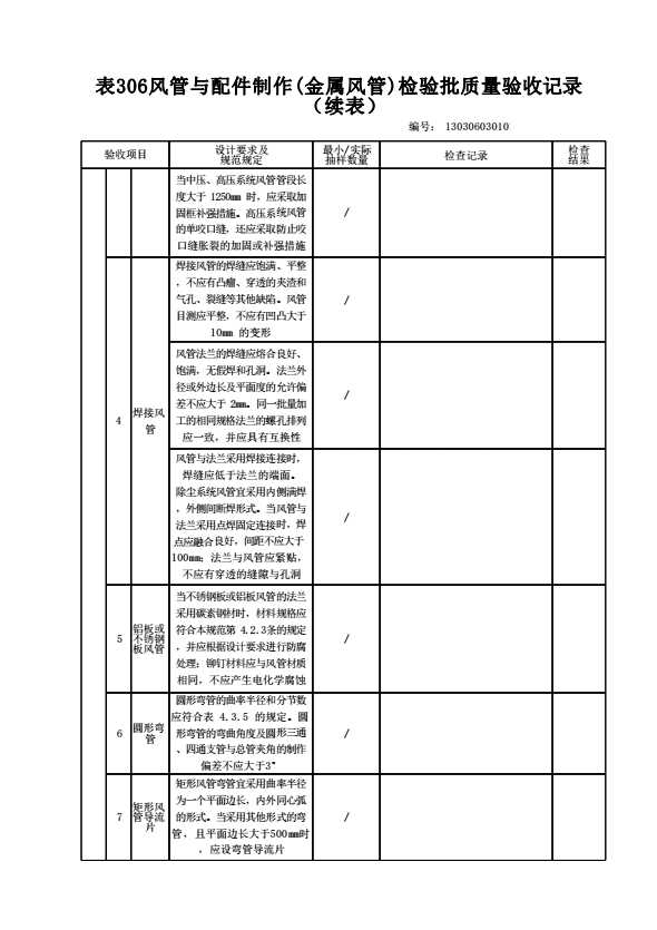 表格名称:130306030101 风管与配件制作(金属风管)检验批质量验收记录