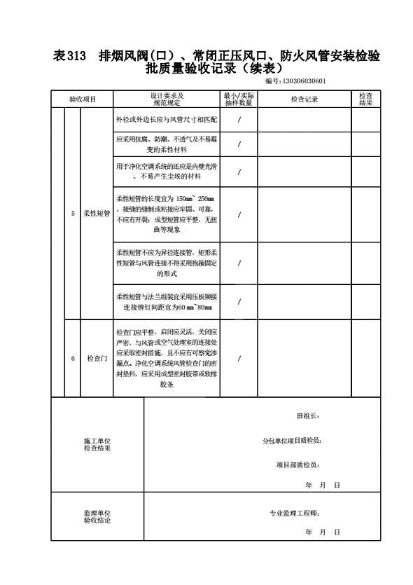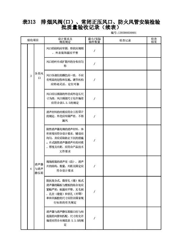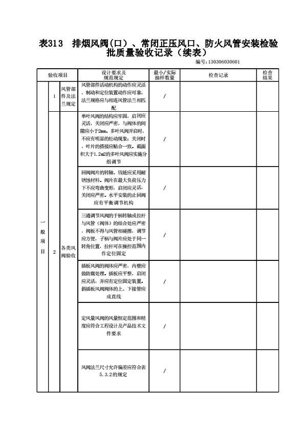 表格名称:130306030601 排烟风阀(口)、常闭正压风口、防火风管安装检验批质量验收记录