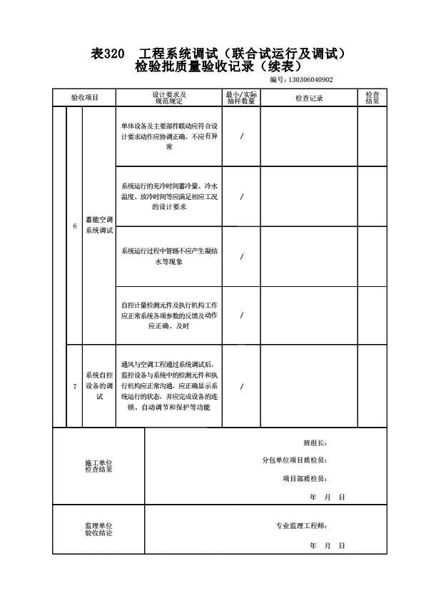 表格名称:130306040902 工程系统调试(联合试运行及调试)检验批质量验收记录