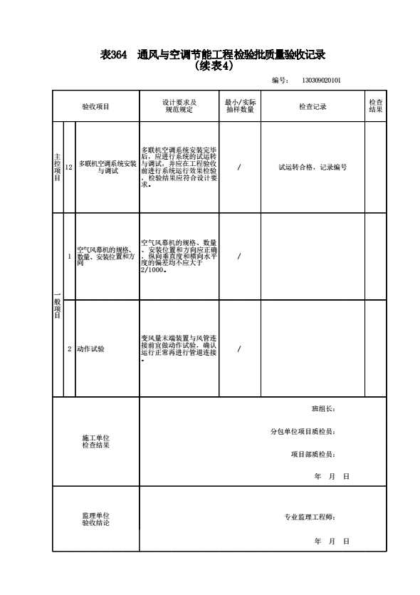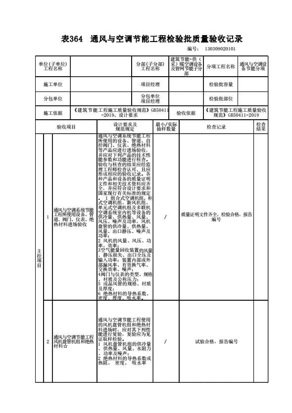 表格名称:130309020101 通风与空调节能工程检验批质量验收记录