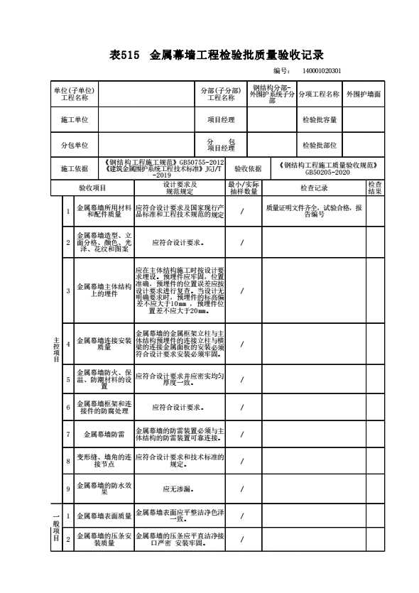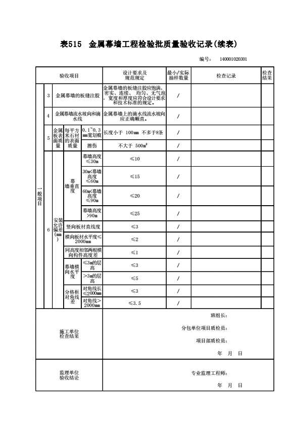 表格名称:140001020301 金属幕墙工程检验批质量验收记录