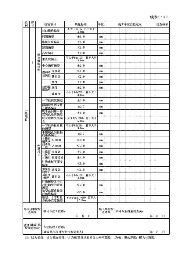表格名称:表5.13.8 钢构件(多节钢柱)组装工程检验批质量验收记录