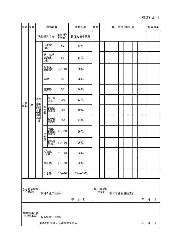 表格名称:表5.31.9 卫生器具排水管道安装检验批质量验收记录