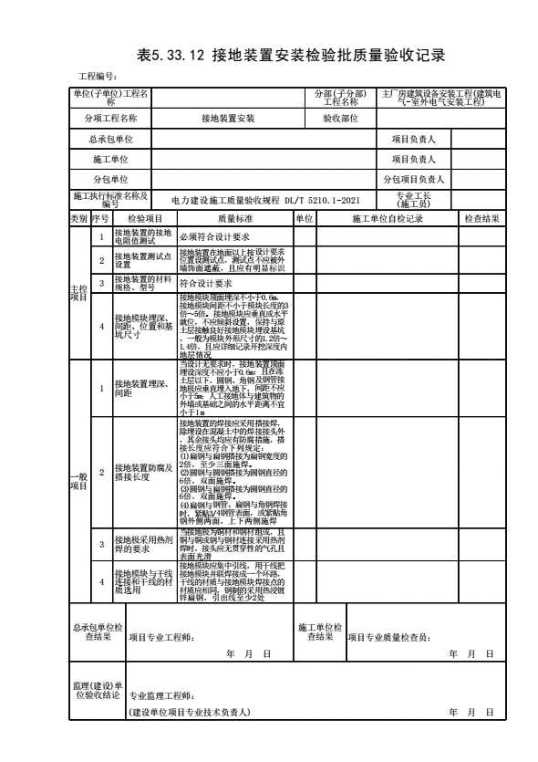 表格名称:表5.33.12 接地装置安装检验批质量验收记录