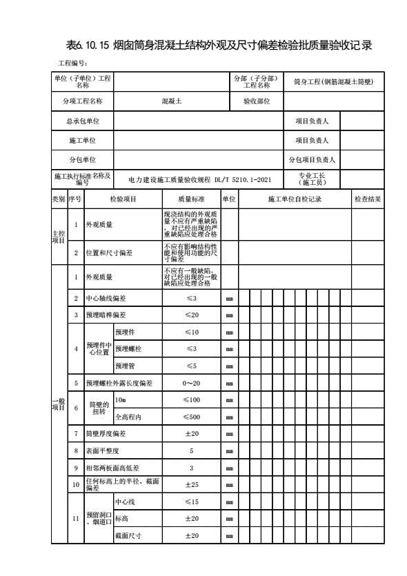 表格名称:表6.10.15烟囱筒身混凝土结构外观及尺寸偏差检验批质量验收记录