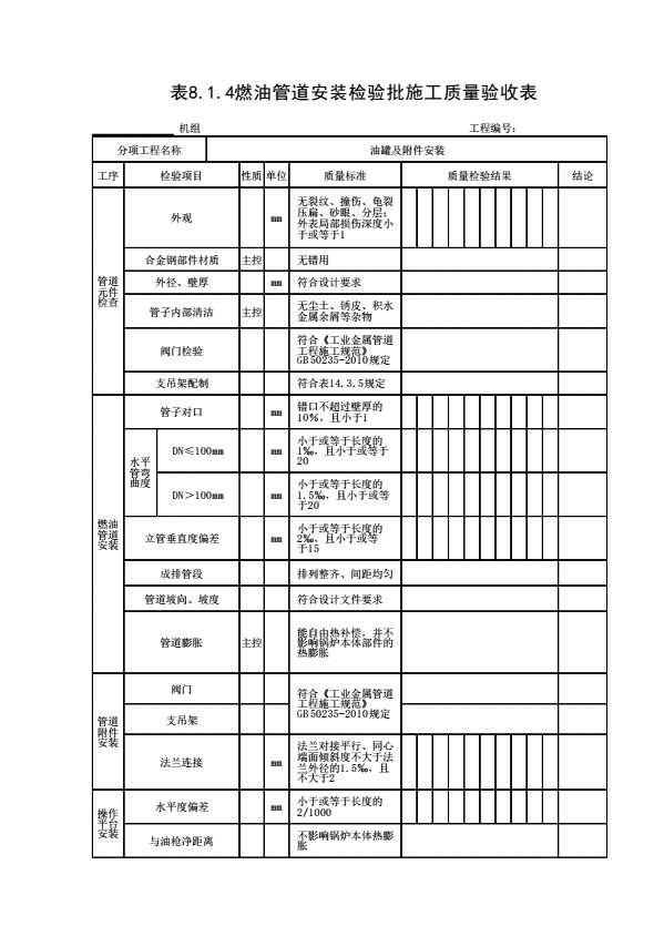 表格名称:表8.1.4 燃油管道安装检验批施工质量验收表