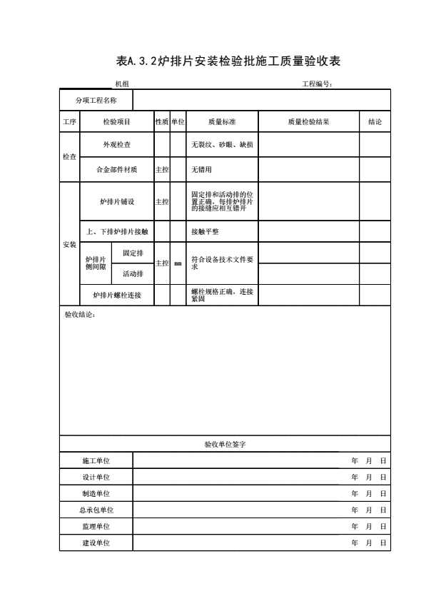 表格名称:表A.3.2 炉排片安装检验批施工质量验收表