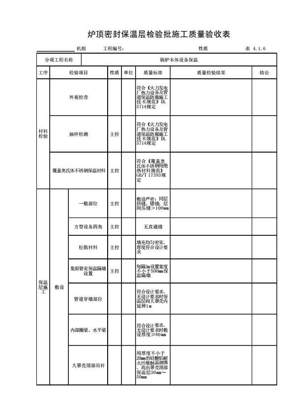 表格名称:表4.1.6 炉顶密封保温层检验批施工质量验收表