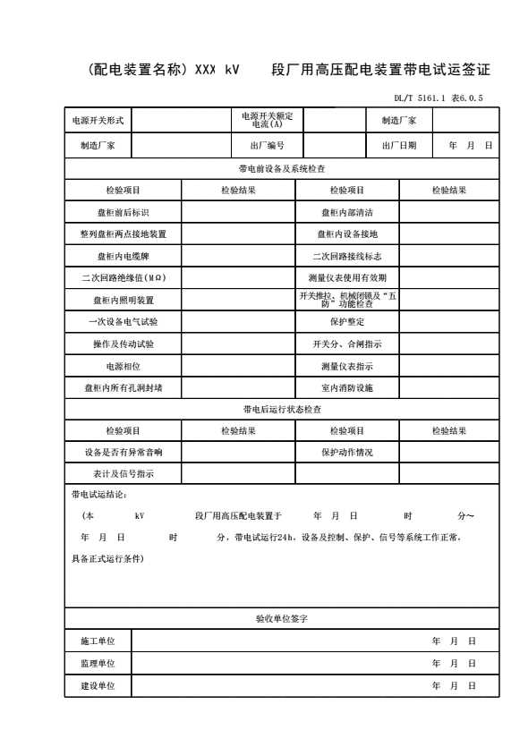 表格名称:表6.0.5 XXXkV 段厂用高压配电装置带电试运签证