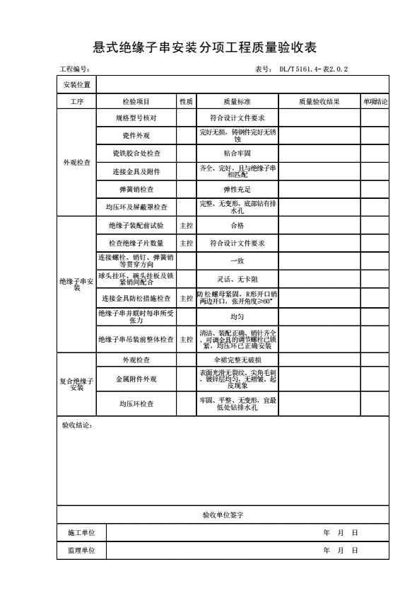 表格名称:表2.0.2 悬式绝缘子串安装分项工程质量验收表