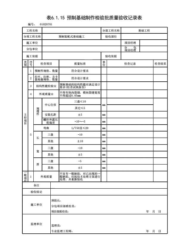 表格名称:表6.1.15 预制基础制作检验批质量验收记录表