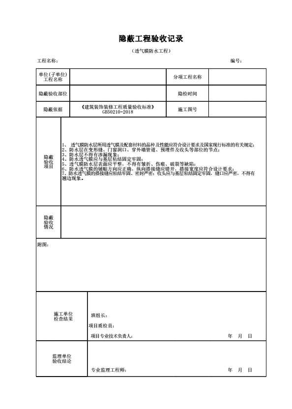 表格名称:隐蔽工程验收记录(透气膜防水工程)