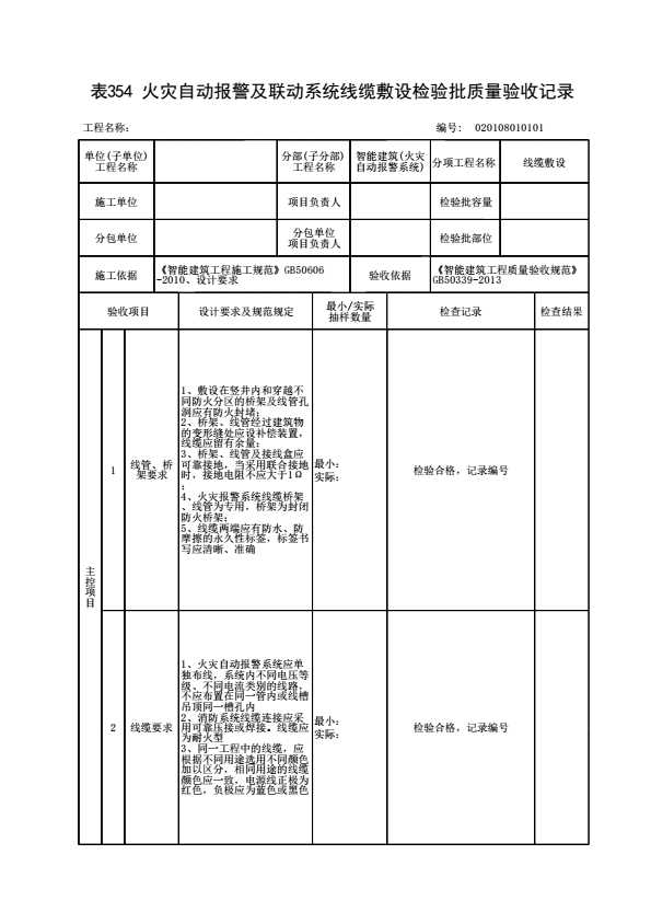 表格名称:020108010101 火灾自动报警及联动系统线缆敷设检验批质量验收记录