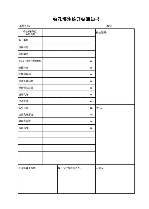 表格名称:钻孔灌注桩开钻通知书