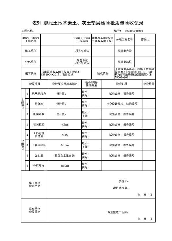 表格名称:090301040301 膨胀土地基素土、灰土垫层检验批质量验收记录