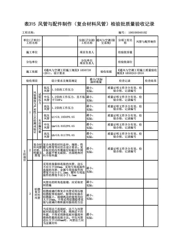 表格名称:100106040102 风管与配件制作(复合材料风管)检验批质量验收记录