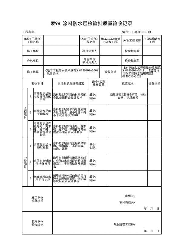 表格名称:100301070104 涂料防水层检验批质量验收记录