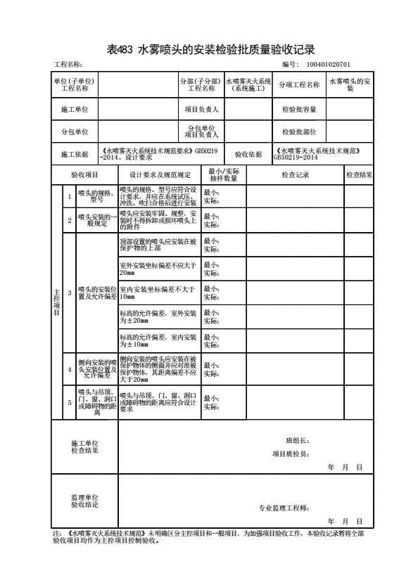 表格名称:100401020701 水雾喷头的安装检验批质量验收记录