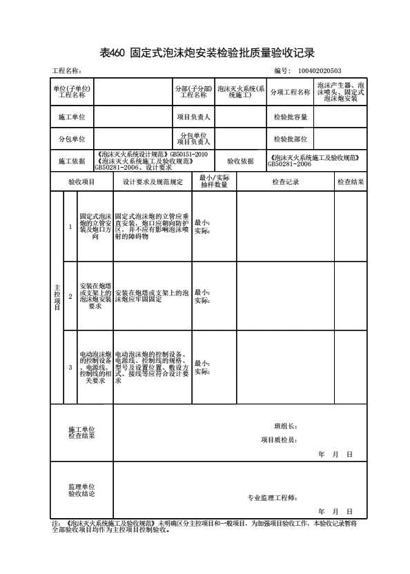 表格名称:100402020503 固定式泡沫炮安装检验批质量验收记录