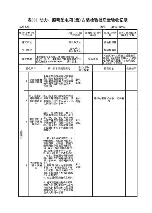 表格名称:110107010101 动力、照明配电箱(盘)安装质量标准和检验方法
