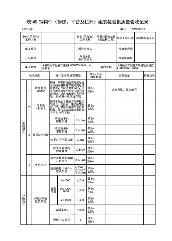 表格名称:130203020405 钢构件(钢梯、平台及栏杆)组装检验批质量验收记录