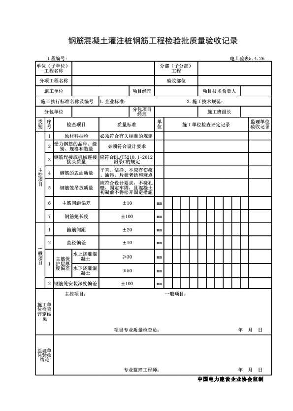 表格名称:电土验表5.4.26 钢筋混凝土灌注桩钢筋工程检验批质量验收记录