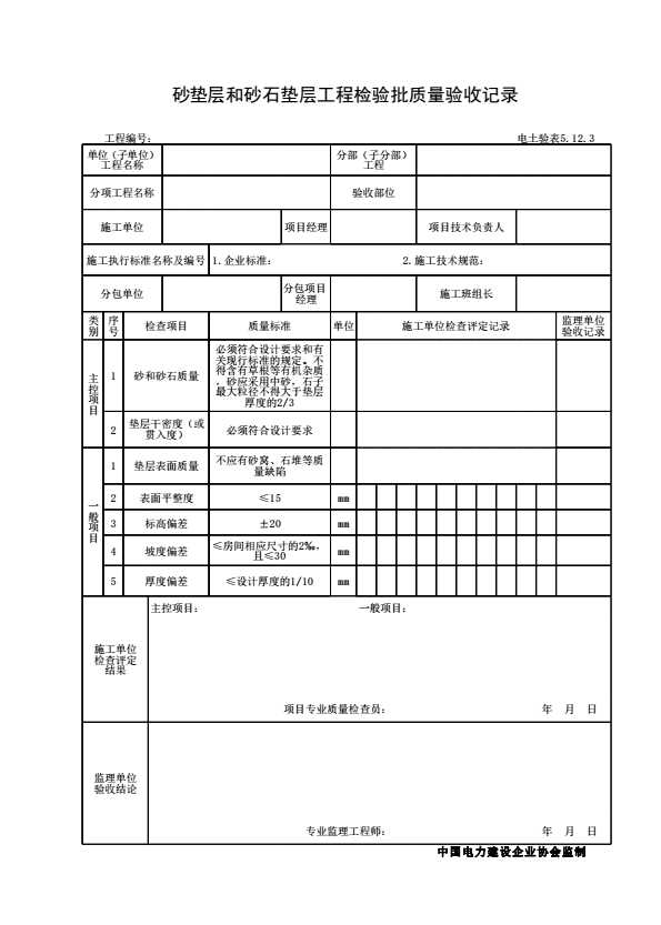 表格名称:电土验表5.12.3 砂垫层和砂石垫层工程检验批质量验收记录