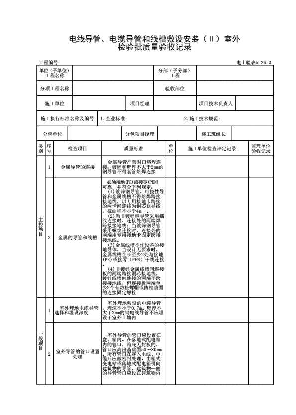 表格名称:电土验表5.26.3 电线导管、电缆导管和线槽敷设安装(II)室外检验批质量验收记录