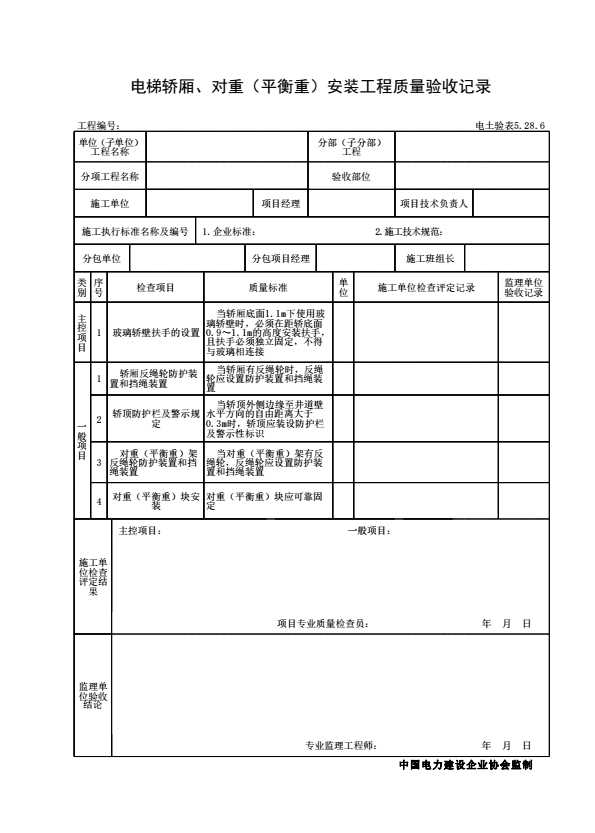 表格名称:电土验表5.28.6 电梯轿厢、对重(平衡重)安装工程质量验收记录