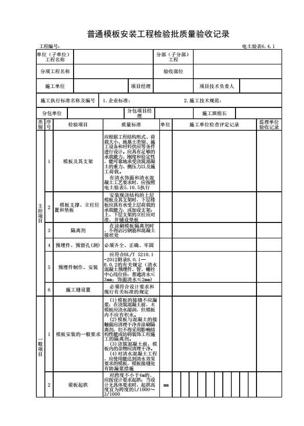 表格名称:电土验表6.4.1 普通模板安装工程检验批质量验收记录