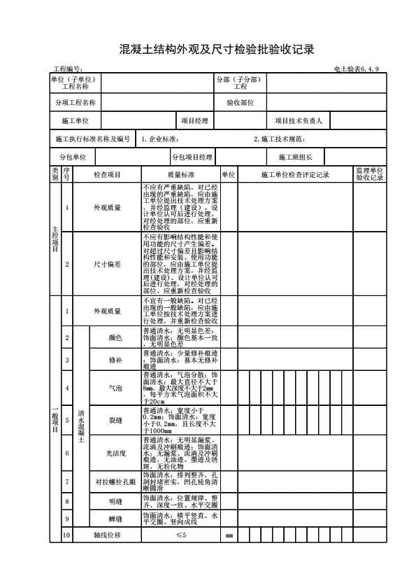 表格名称:电土验表6.4.9 混凝土结构外观及尺寸检验批验收记录