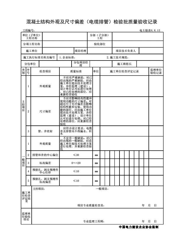 表格名称:电土验表6.8.15 混凝土结构外观及尺寸偏差(电缆排管)检验批质量验收记录