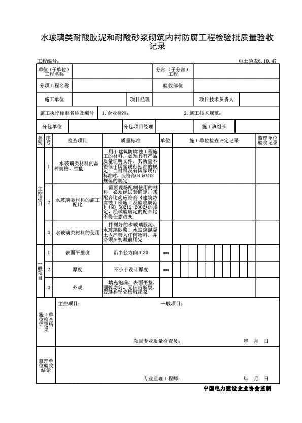 表格名称:电土验表6.10.47 水玻璃类耐酸胶泥和耐酸砂浆砌筑内衬防腐工程检验批质量验收记录