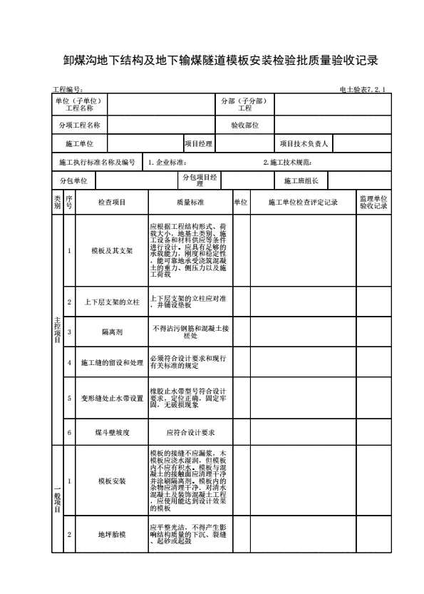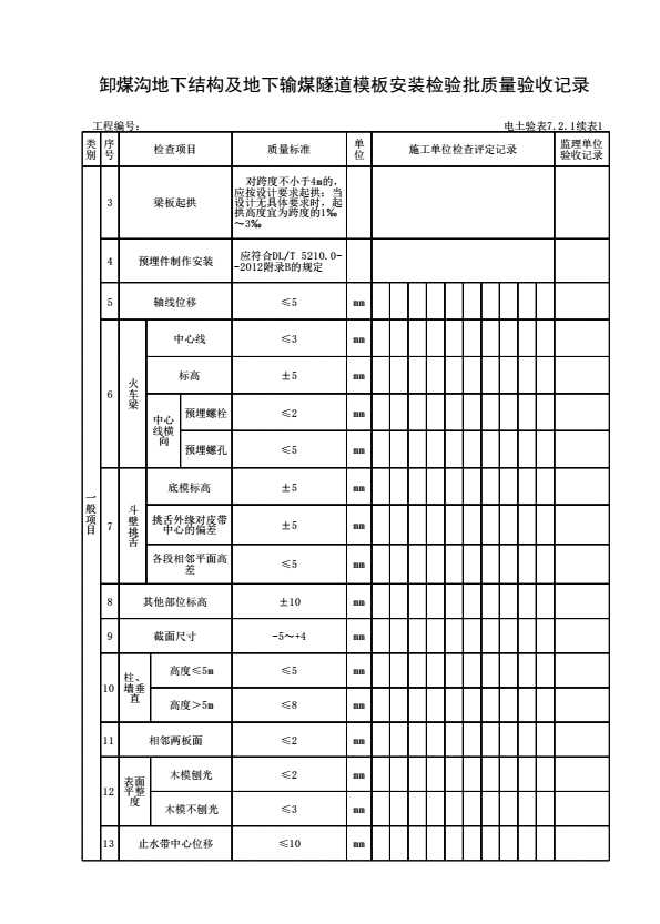 表格名称:电土验表7.2.1 卸煤沟地下结构及地下输煤隧道模板安装检验批质量验收记录